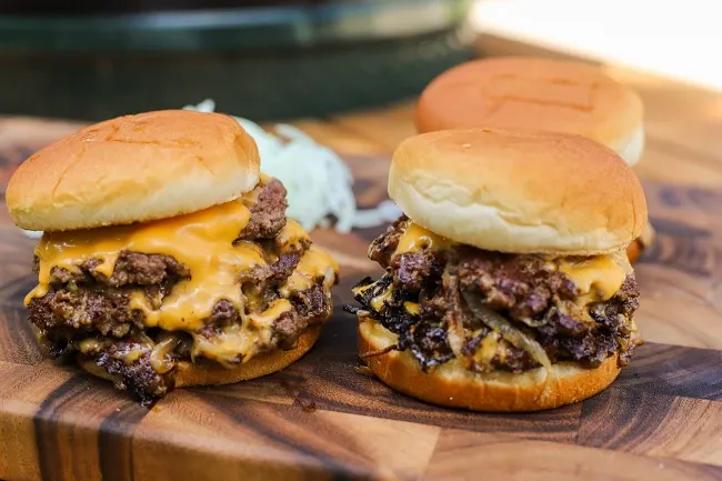 - Smash the burgers as thin as possible and then season each one with Backyard seasoning.