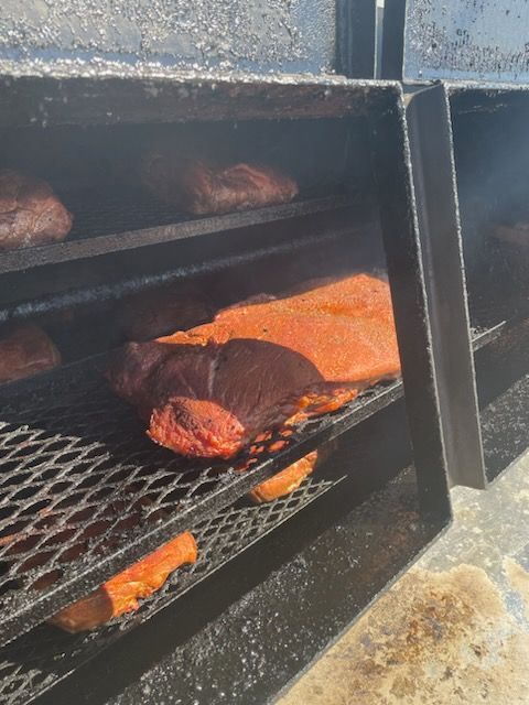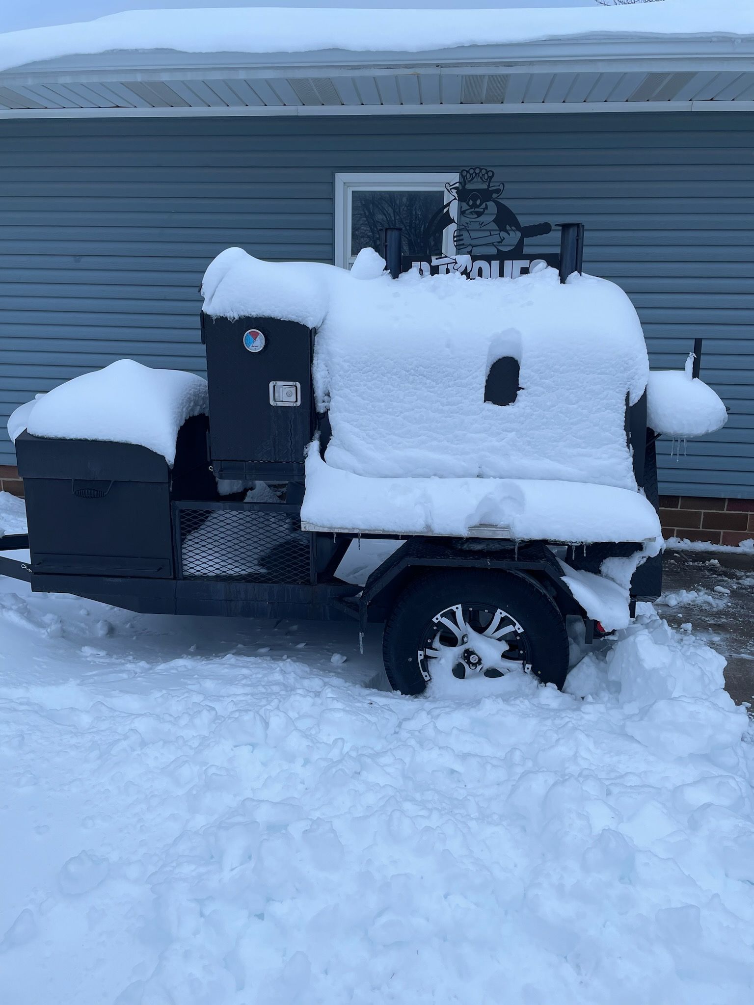 If you haven’t gotten the grill and smoker ready you are running late! Picture below to your left is our B.B. Ques smoker after a long winter storm. The other two pictures below are our smoker in action recently this Spring!